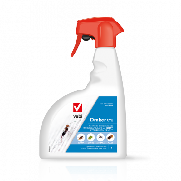 Draker RTU è un insetticida acaricida liquido microincapsulato pronto all’uso a base acqua. È a largo spettro d’azione e lunga persistenza. La formulazione contiene due principi attivi: la Tetrametrina dall’elevata efficacia abbattente, e la Cipermetrina che garantisce un’azione residuale al prodotto. È efficace nel controllo di pulci, acari, tarme, blatte, formiche, cimici, zecche, ragni, lepisme…