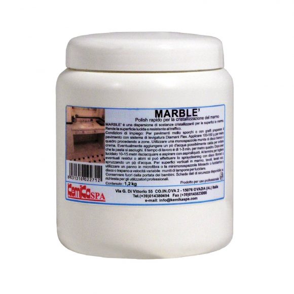MARBLÉ è una dispersione di sostanze cristallizzanti delle superfici in marmo. Rende la superficie lucida e resistente al traffico. La reazione di cristallizzazione avviene tra i sali e gli ossidi presenti in MARBLÉ e i carbonati presenti nel marmo. MARBLÉ non ha caratteristiche abrasive, ma solo lucidanti. La lucidatura del marmo con MARBLÉ diminuisce la…