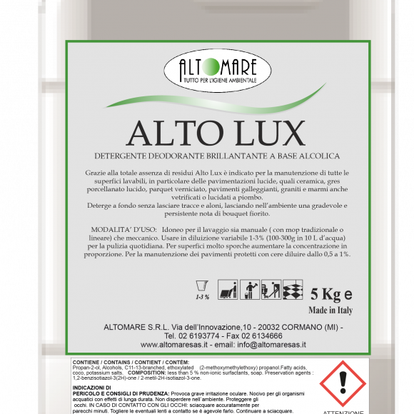 ALTOLUX DETERGENTE ALCOLICO DEODORANTE E BRILLANTANTE CARATTERISTICHE E CAMPI D’IMPIEGO Detergente a base alcolica ad azione brillantante e deodorante. Grazie alla totale assenza di residui è particolarmente indicato per la manutenzione di tutte le superfici lavabili, in particolare delle pavimentazioni lucide, quali ceramiche, grès porcellanato lucido, pavimenti vetrificati e marmi lucidati a piombo, parquet verniciati,…