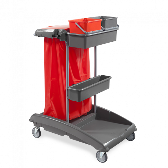 Carrello multiuso IdeaTop 1 completo di: base più finalino in polipropilene copolimero, 1 spalla diritta con maniglia, 2 secchi da 6 lt, 1 cestello portasecchi,1 cestello portaoggetti, reggisacco completo di 2 portamanico e 4 agganci, 4 ruote Ø 100 mm.
