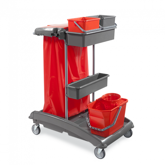 Carrello multiuso IdeaTop 7 completo di: base più finalino in polipropilene copolimero, 1 spalla diritta con maniglia, 2 secchi da 6 lt, 1 secchio COMFORT da 15 lt, 1 cestello portasecchi, 1 cestello portaoggetti, reggisacco completo di 2 portamanico e 4 agganci, 4 ruote Ø 100 mm.
