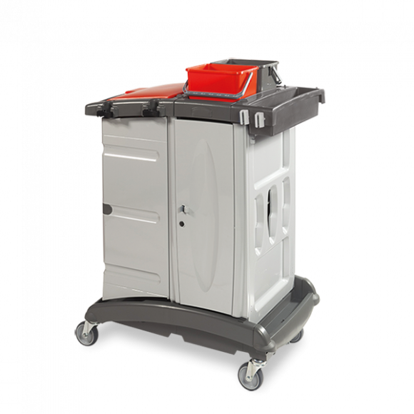 Carrello multifunzione in plastica completo di: 1 coperchio, 7 portamanico integrati, 1 cursore scorrevole per reggisacco doppio, 2 secchi da 6 lt, 2 antine centrali, 1 vassoio centrale, 1 coppia sportelli (dx/sx), 1 cestello portasecchi e 4 ruote Ø 100 mm.