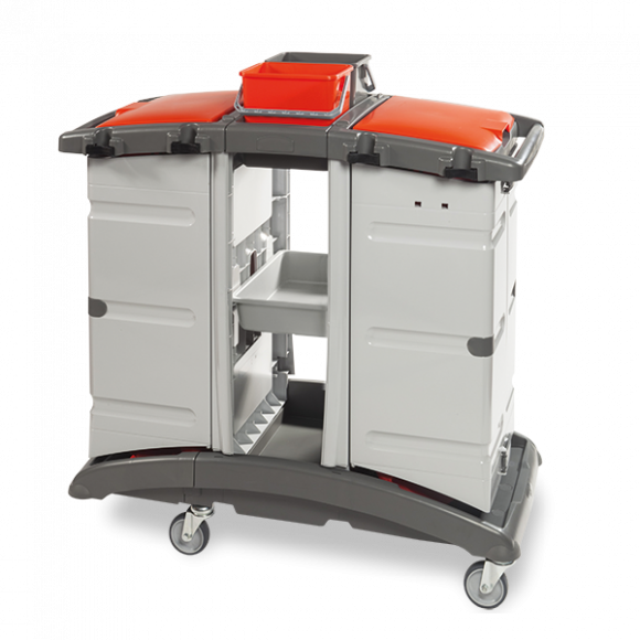 Carrello multifunzione in plastica completo di: 2 coperchi, 8 portamanico integrati, 2 cursori scorrevoli per reggisacco doppio, 2 secchi da 6 lt, 1 vassoio centrale, 2 coppie sportelli (dx/sx) e 5 ruote Ø 100 mm
