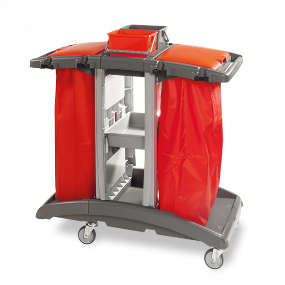 Carrello multifunzione in plastica completo di: 2 coperchi, 8 portamanico integrati, 2 cursori scorrevoli per reggisacco doppio, 2 secchi da 6 lt, 1 vassoio centrale e 5 ruote Ø 100 mm.
