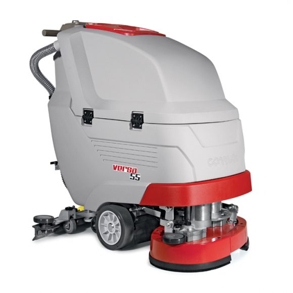 Versa è una lavasciuga pavimenti uomo a terra alimentata a batteria, a trazione automatica, disponibile nella versione lavante con 2 spazzole a disco da 55 o 65 cm di pista di lavoro.